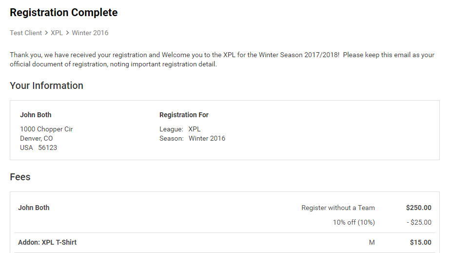 View a message from the league admin along with a receipt of payment if payment was made. This information will also be emailed as well.